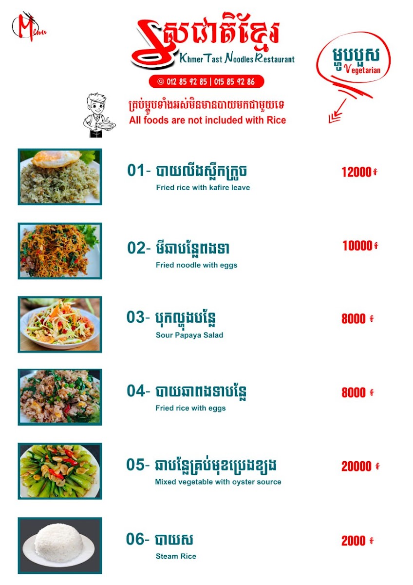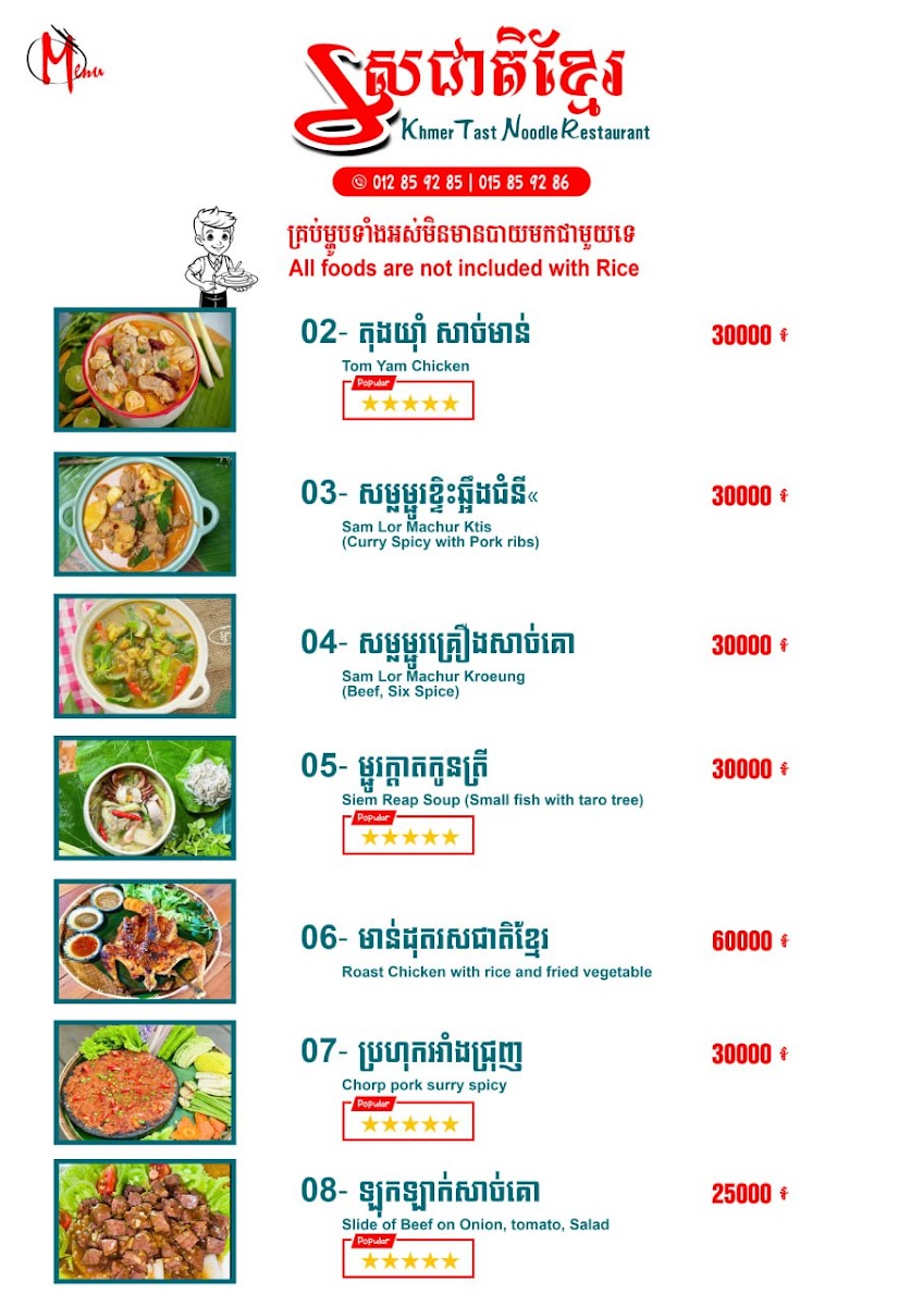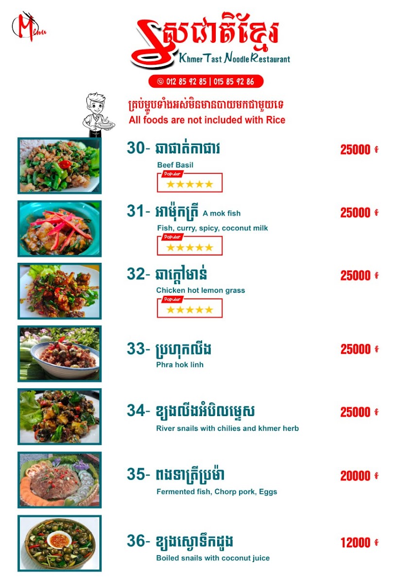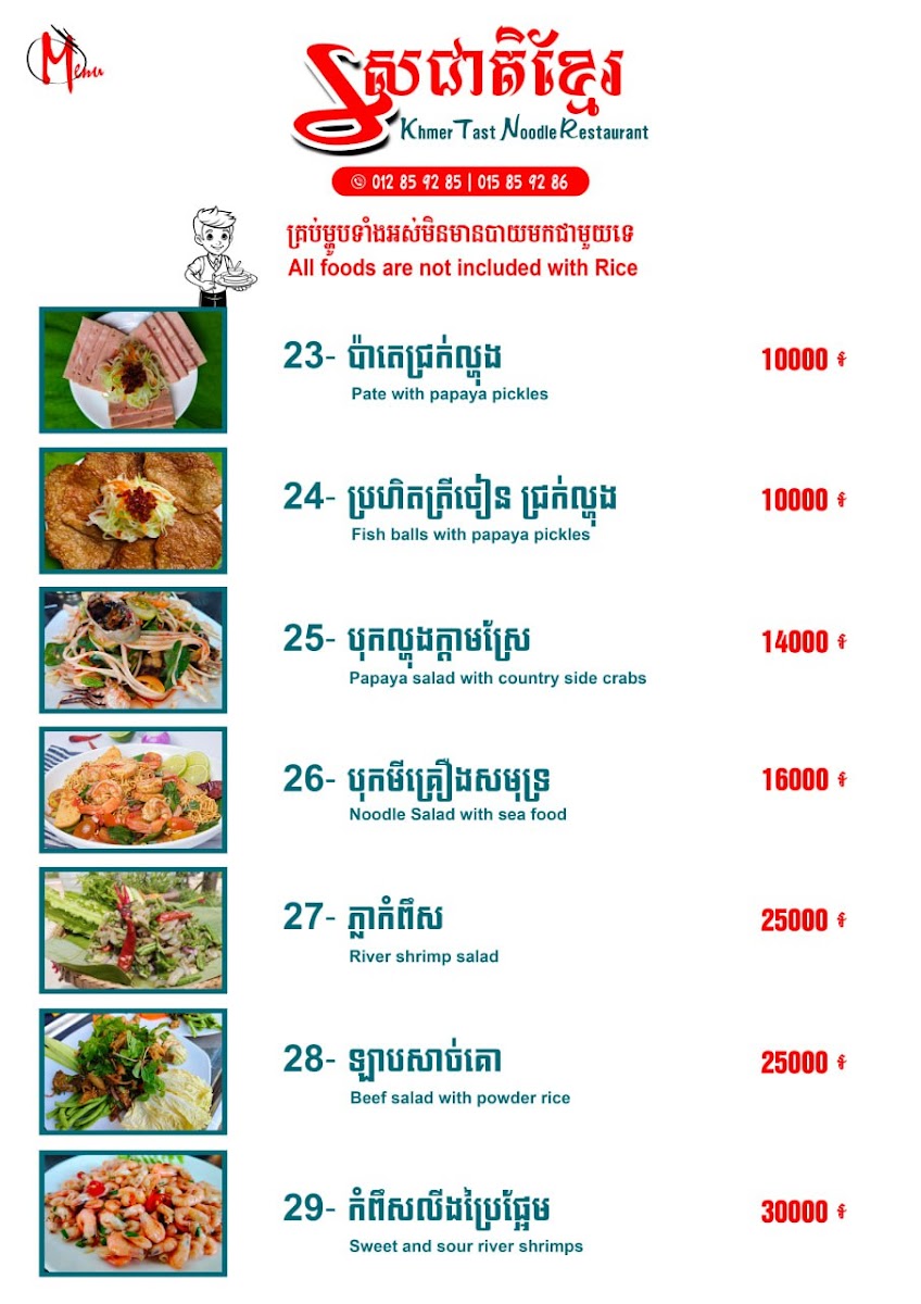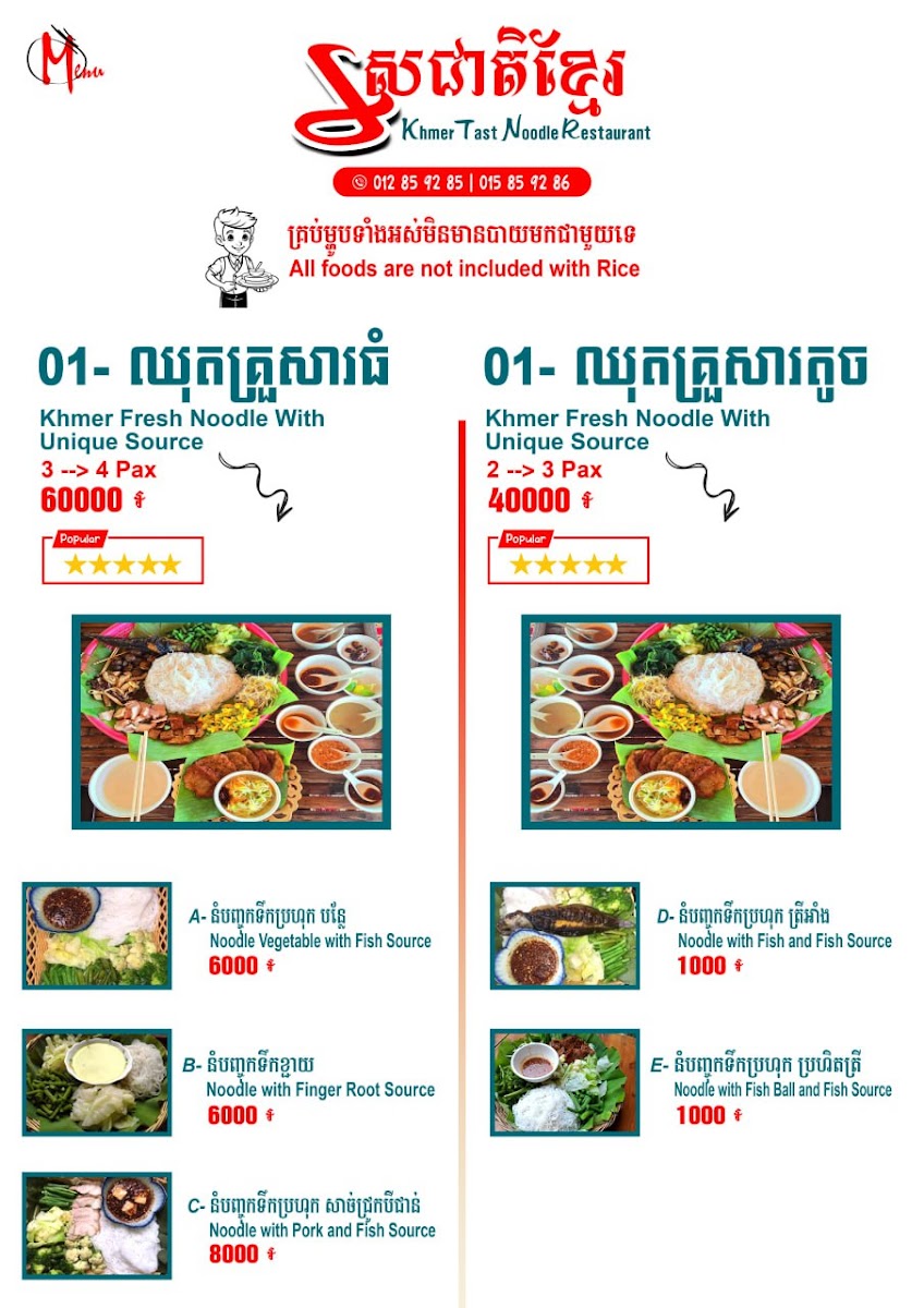 From a reviewer’s perspective, the menu at Khmer Taste Noodles Restaurant នំបញ្ចុកទឹកប្រហុក រសជាតិខ្មែរ on Street 60 in Krong Siem Reap offers a compact yet enticing selection that highlights authentic Khmer flavors. Diners can start with A La Cart options such as ប្រហិតត្រីចៀន, which showcase the restaurant’s skill in preparing traditional fish dishes. For lighter accompaniments, the Salad And Sauce section features បន្លែថែម, along with flavorful dips like Fish Paste Sauce and Pounded Chili Paste Dipping Sauce, providing a balance of fresh and pungent tastes. The heart of the menu lies in the Khmer Noodle offerings, where sets are designed for sharing: the Small Family Set and the Large Family Set cater to different appetites, while individual dishes such as Beef Tripe With Khmer Noodle And Fish Paste Sauce and សាច់នំបញ្ចុកសុទ្ធ Khmer Noodle Pork Belly With Fish Paste Sauce emphasize rich, savory flavors that are both comforting and deeply traditional. The combination of family-style noodle sets with distinct dipping sauces makes the menu approachable yet authentic, allowing guests to sample a range of textures and tastes that reflect true Cambodian cuisine. Overall, the menu is thoughtfully curated to provide a satisfying experience, whether for first-time visitors seeking classic Khmer flavors or for regulars looking for a familiar, hearty meal.