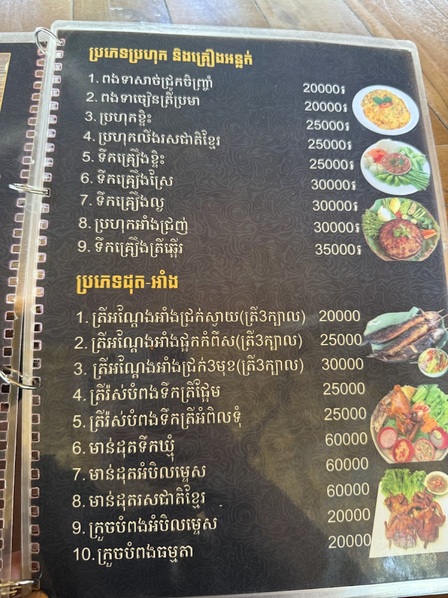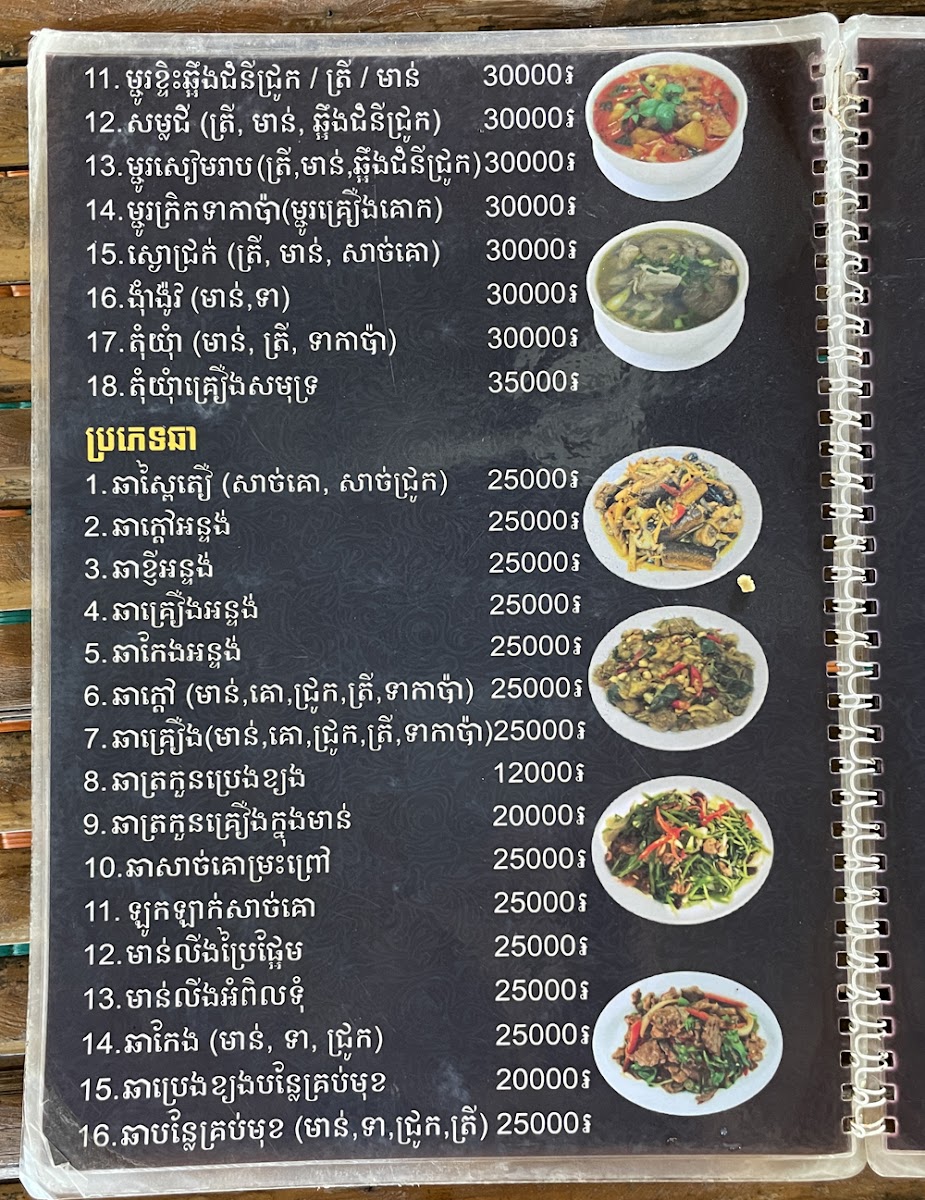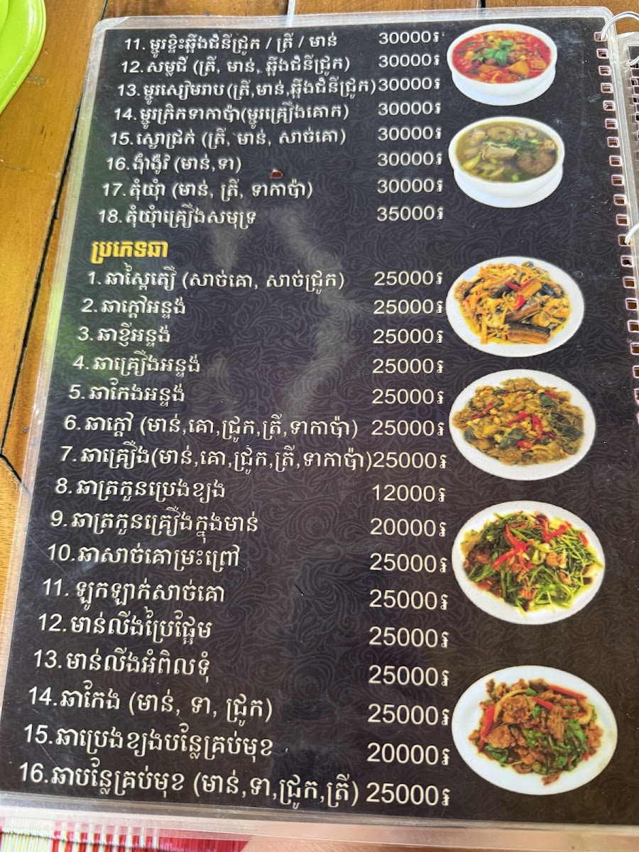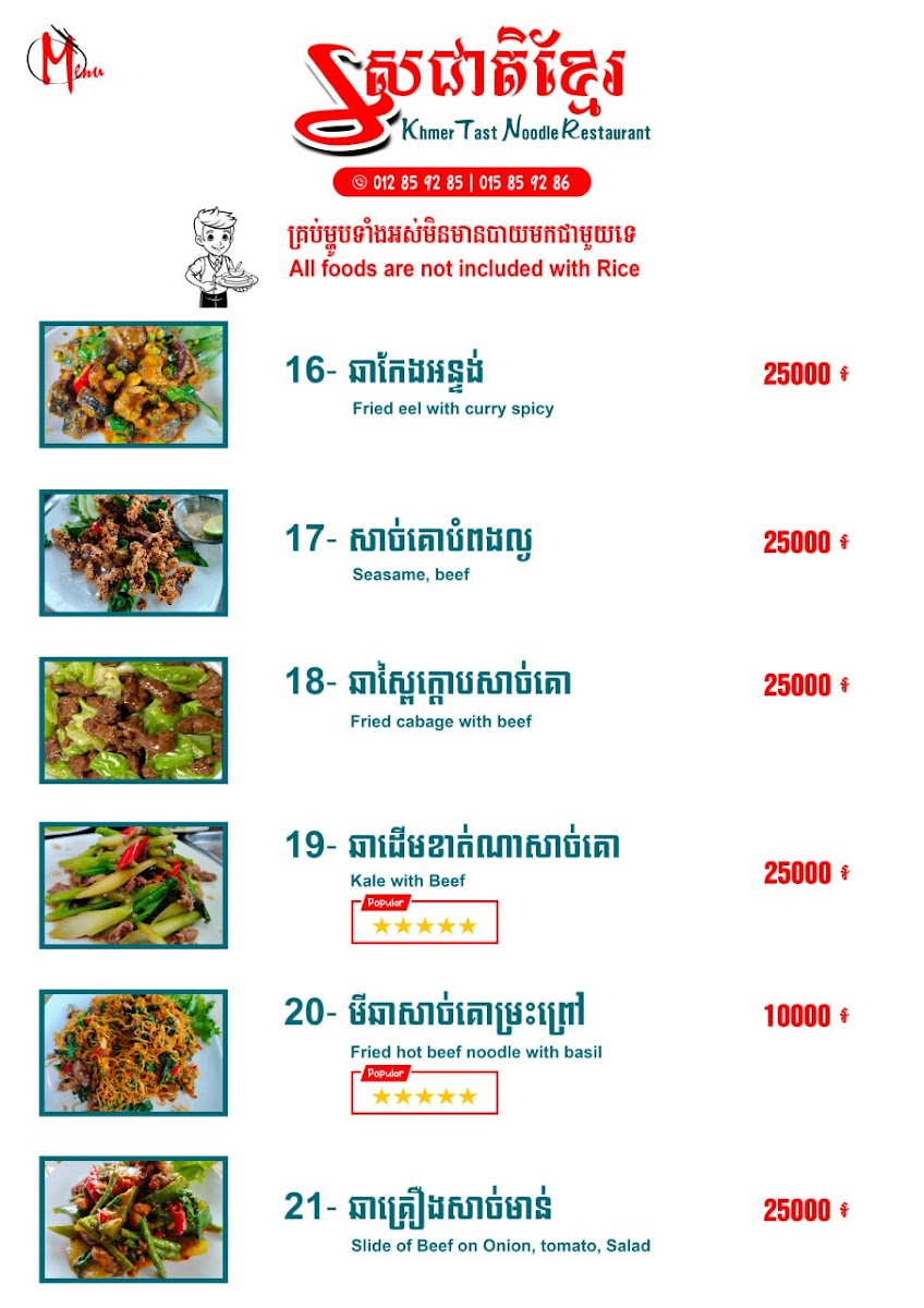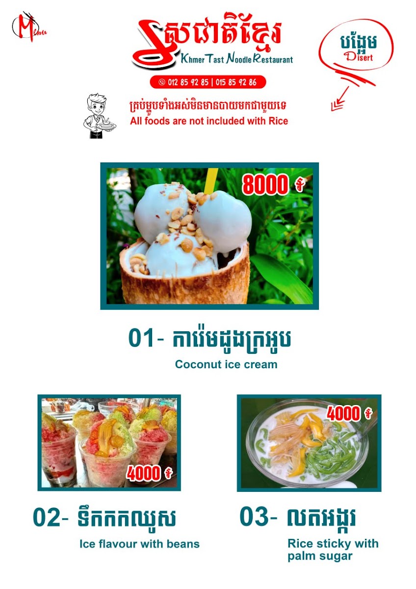 From a reviewer’s perspective, the menu at Khmer Taste Noodles Restaurant នំបញ្ចុកទឹកប្រហុក រសជាតិខ្មែរ on Street 60 in Krong Siem Reap offers a compact yet enticing selection that highlights authentic Khmer flavors. Diners can start with A La Cart options such as ប្រហិតត្រីចៀន, which showcase the restaurant’s skill in preparing traditional fish dishes. For lighter accompaniments, the Salad And Sauce section features បន្លែថែម, along with flavorful dips like Fish Paste Sauce and Pounded Chili Paste Dipping Sauce, providing a balance of fresh and pungent tastes. The heart of the menu lies in the Khmer Noodle offerings, where sets are designed for sharing: the Small Family Set and the Large Family Set cater to different appetites, while individual dishes such as Beef Tripe With Khmer Noodle And Fish Paste Sauce and សាច់នំបញ្ចុកសុទ្ធ Khmer Noodle Pork Belly With Fish Paste Sauce emphasize rich, savory flavors that are both comforting and deeply traditional. The combination of family-style noodle sets with distinct dipping sauces makes the menu approachable yet authentic, allowing guests to sample a range of textures and tastes that reflect true Cambodian cuisine. Overall, the menu is thoughtfully curated to provide a satisfying experience, whether for first-time visitors seeking classic Khmer flavors or for regulars looking for a familiar, hearty meal.